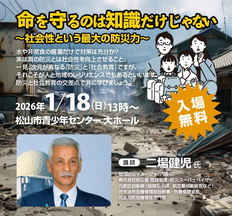 そんな中、地球規模での気候変動や地震活動の活発化による災害が増えていると言われ、私たちが住み暮らす地域にも、いつ発生してもおかしくないとされる『南海トラフ地震』への備えの必要性が叫ばれています。 地理的にも愛媛県では、自助、共助の活動が必要とされ、そのためにも社会性の向上が減災効果やレジリエンスの能力を左右すると考えられます。